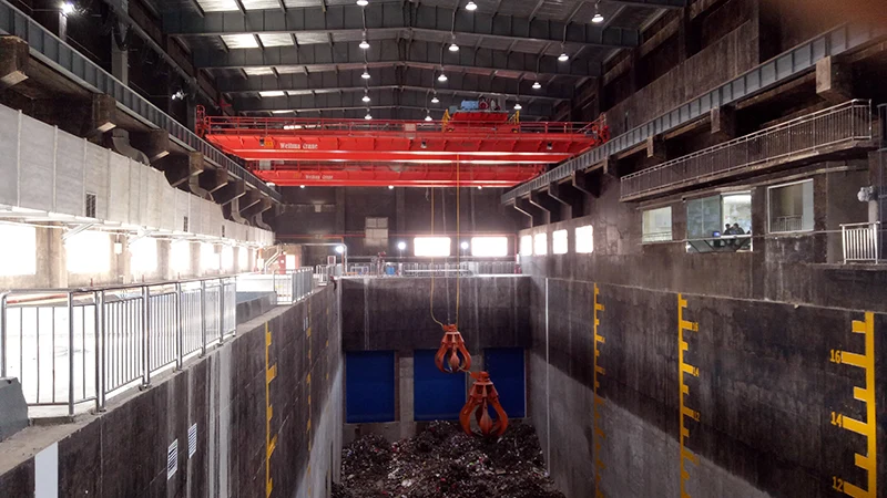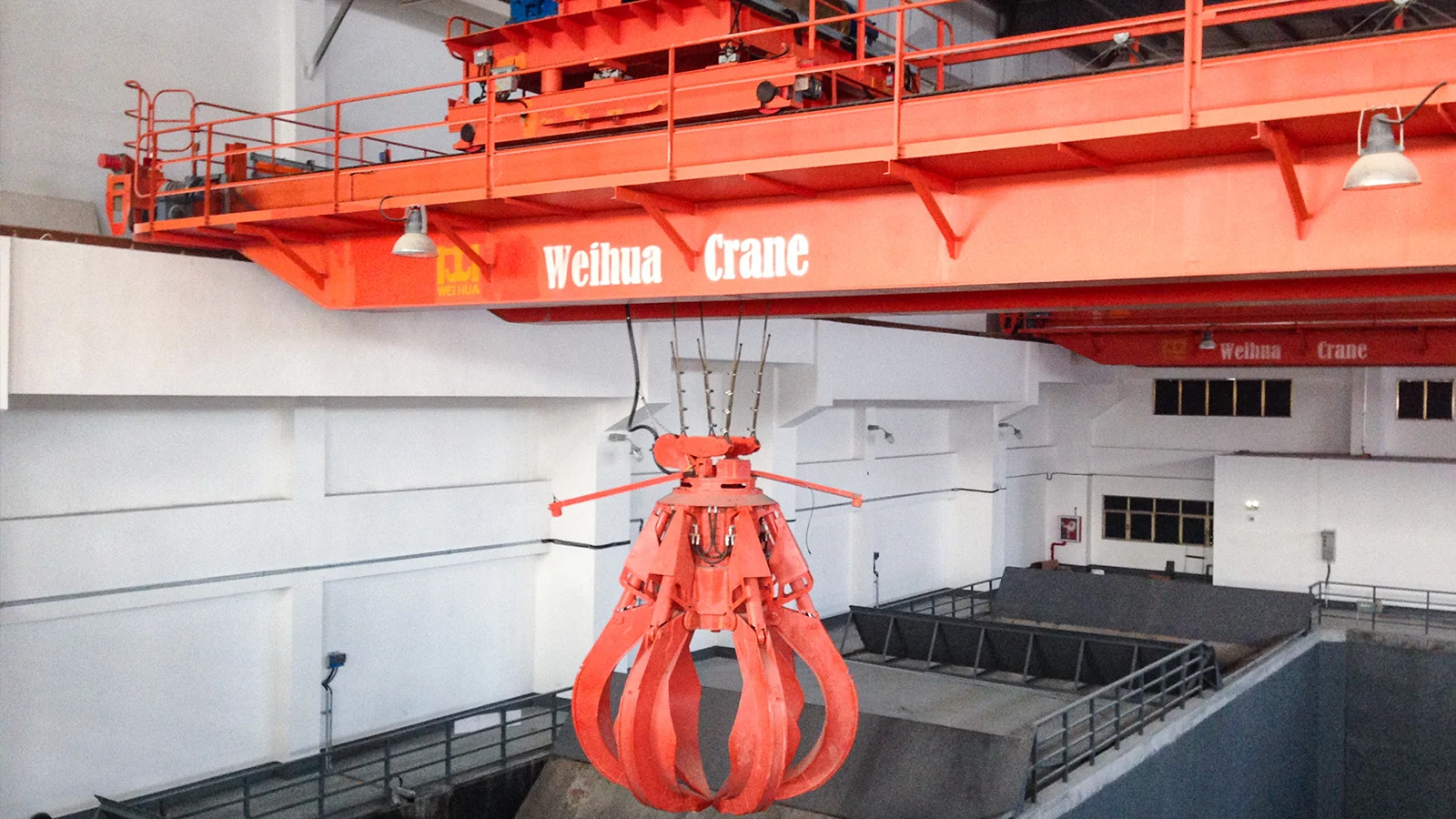 Double girder overhead crane with grab consists of girders, crane traveling mechanism, trolley, electric system and grab. Double girder overhead crane with grab is widely used in power stations, warehouses, workshops and ports to grab or lift bulk materials. The lifting capacity includes the weight of grab and the grab opening direction is parallel or vertical to the main girders.
