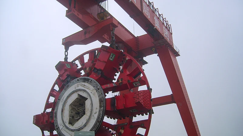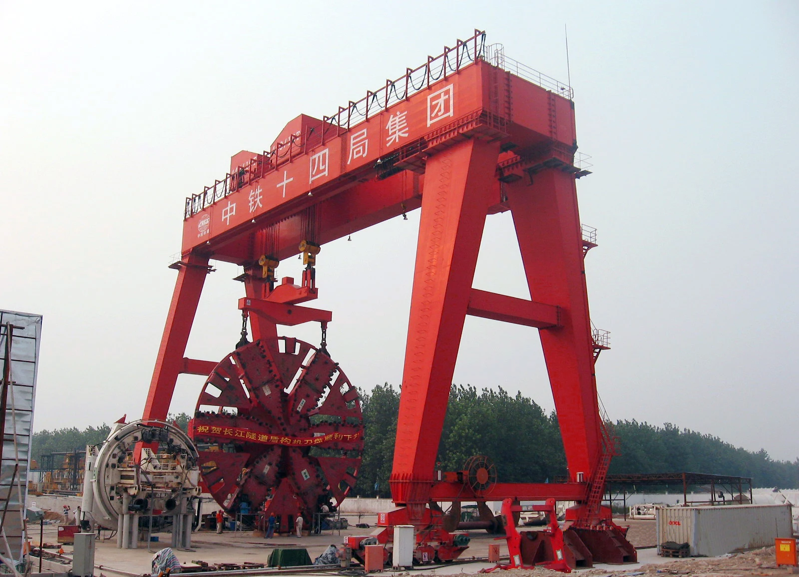 Gantry crane for shield tunneling machine is used for lifting of the cutter and shield body of underground non excavation shield tunneling machine and the tunnel support segment in the process of the construction. The trolley of this gantry crane is a rotating disc adapts to the demand of different digging direction with flexible operation, perfect safety instructions and overload protection device system.